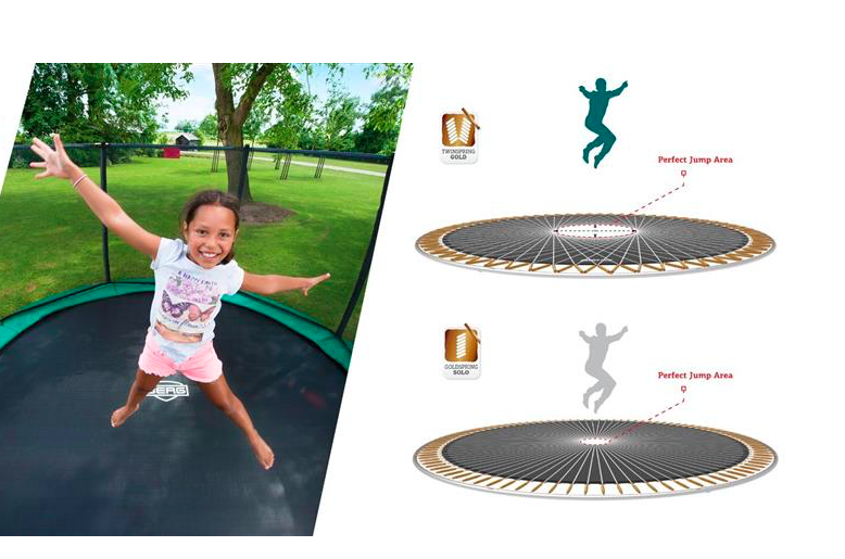 Durch die diagonal angeordneten TwinSpring-Federn können Sie auf dem gesamten Trampolin bequemer und sicherer springen. Das AirFlow-Sprungtuch ist 50% atmungsaktiver. Dies bietet weniger Widerstand während des Sprungs, so dass Sie höher springen.